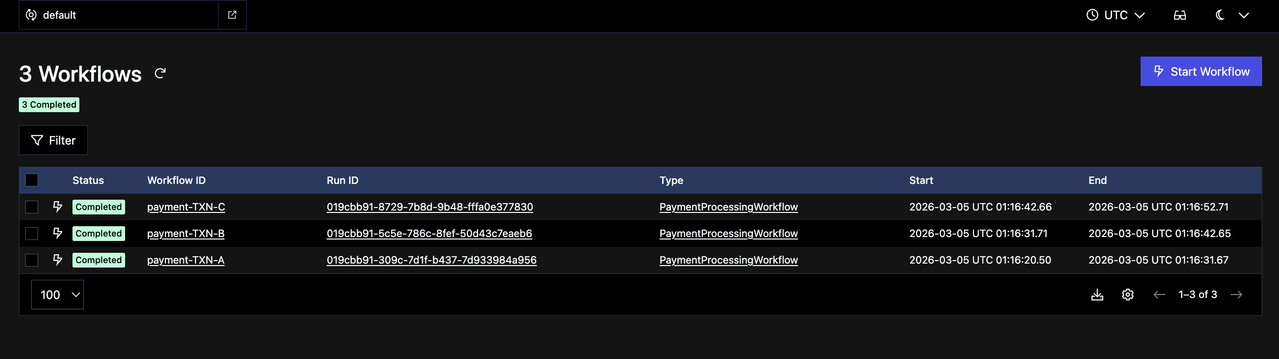 You'll see three completed executions of the PaymentProcessingWorkflow: